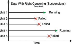 The most common case of censoring is what is referred to as right censored data, or suspended data. In the case of life data, these data sets are composed of units that did not fail. For example, if we tested five units and only three had failed by the end of the test, we would have suspended data (or right censored data) for the two unfailed units. The term right censored implies that the event of interest (i.e. the time-to-failure) is to the right of our data point. In other words, if the units were to keep on operating, the failure would occur at some time after our data point (or to the right on the time scale).